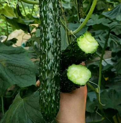 产品特性:叶片中等,主蔓结瓜为主,瓜码密,回头瓜多,瓜条生长速度快,丰产潜力大。早熟性好,耐低温弱光能力强,高抗霜酶病、枯萎病。瓜条顺直,皮色深绿,光泽度好,瓜把短,刺瘤密,腰瓜长36cm左右,商品瓜率高,单瓜中200g左右,果肉淡绿色,商品性极佳。适宜日光温室越冬茬及早春茬栽培。