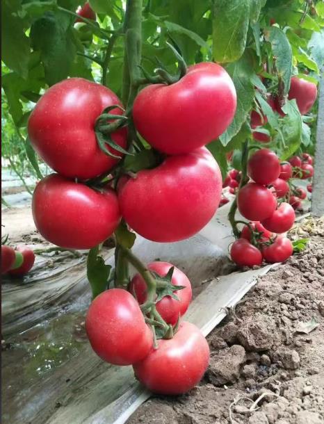 高瑞亮粉番茄苗:早熟、无限生长型粉果番茄,长势强壮,叶片平展,果形周正,产量高,单果重260-320克左右,颜色亮丽,偏白果转色。硬度高,耐裂果,货架期长。