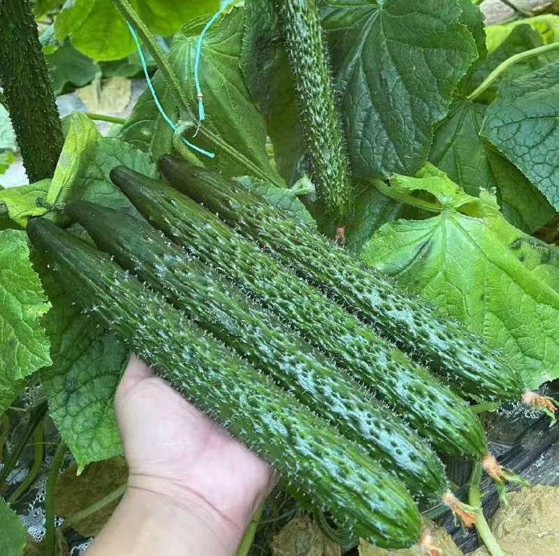 耐寒黄瓜苗品种: 德瑞特9:该品种植株长势强,龙头好,叶片中等,黑绿,节间适中。主蔓结瓜,瓜码密,连续结瓜能力强,返头能力强。腰瓜长度为36厘米左右,短把、密刺、瓜头饱满,颜色黑油亮,无黄线,瓜条整齐顺直,商品性好,总产量高。 秋冬茬黄瓜苗德瑞特891品种特性:高抗寒,长势强,节间适中稳定。10叶7-8支瓜,连续结瓜能力强,短把、密刺、瓜条黑油亮,产量高,抗病能力强,腰瓜长34-36厘米,瓜条整齐、顺直,商品性好。 德瑞特511黄瓜:植株紧凑,长势强,产量高,叶色黑绿,短把、密刺、瓜条黑油亮,节间适中稳定,连续结瓜能力强,腰瓜长34cm,瓜条整齐、顺直,适合茬口:夏提前茬、越夏茬、秋延茬口栽培。